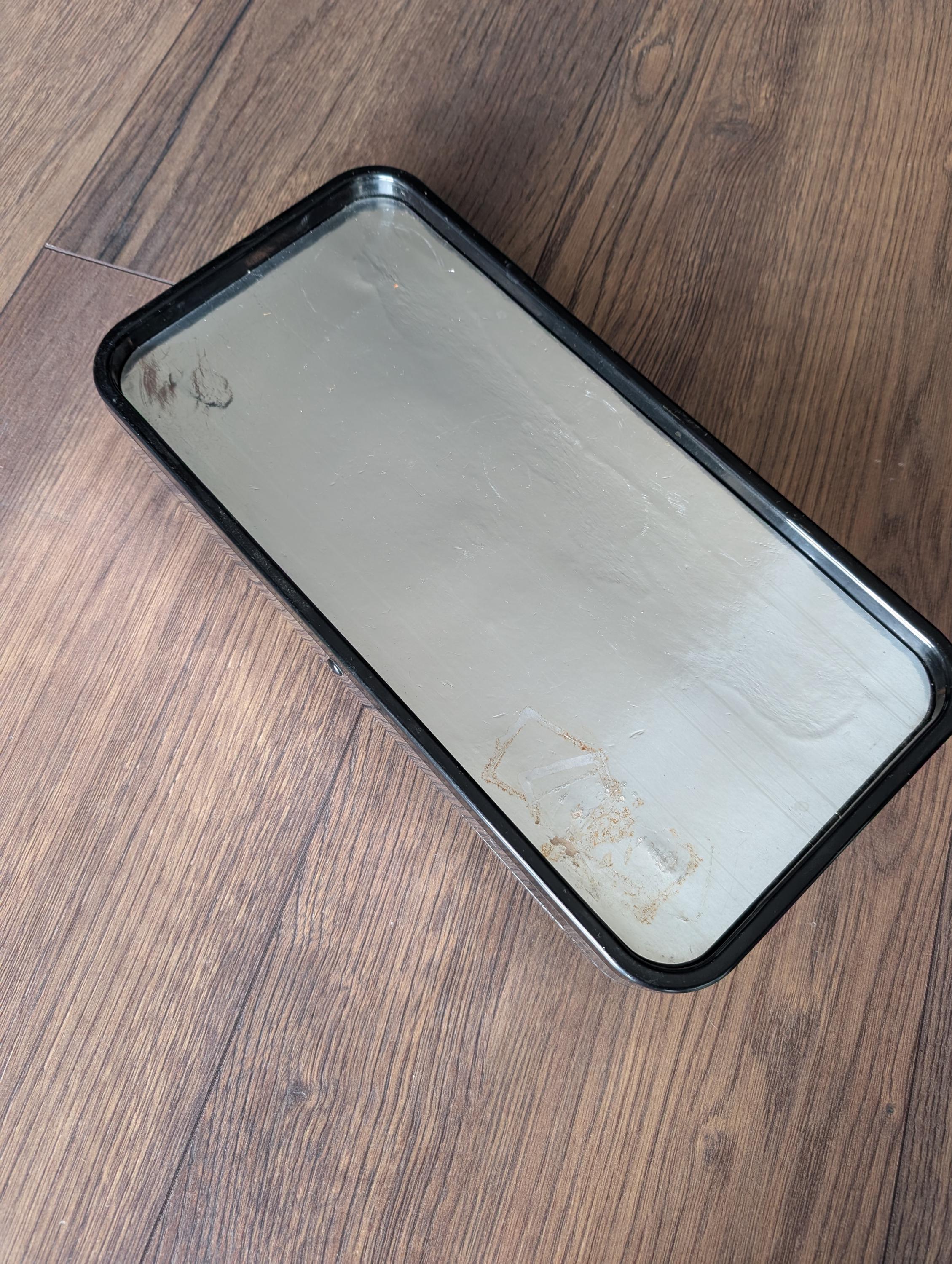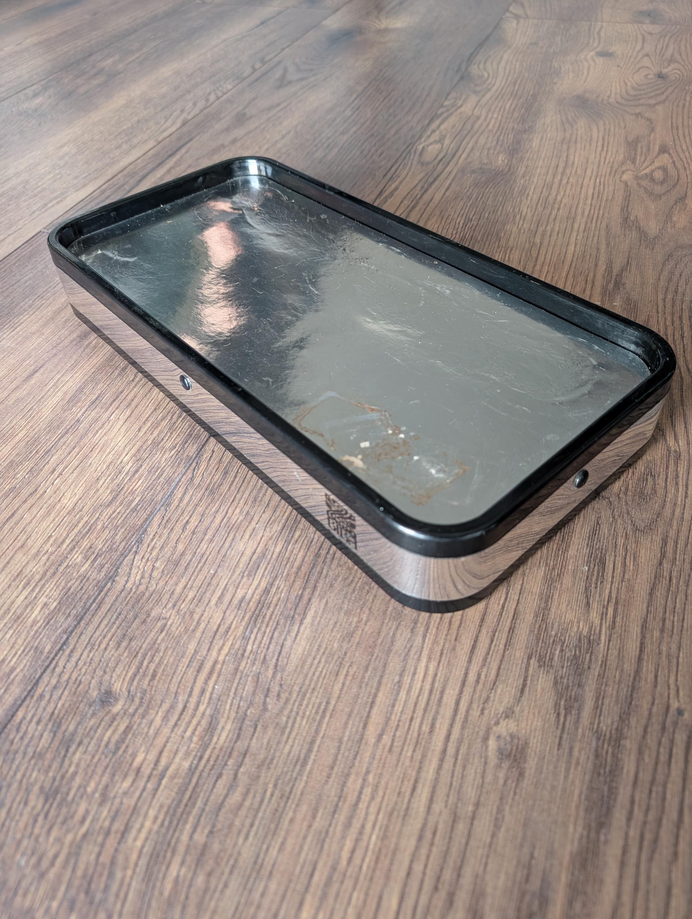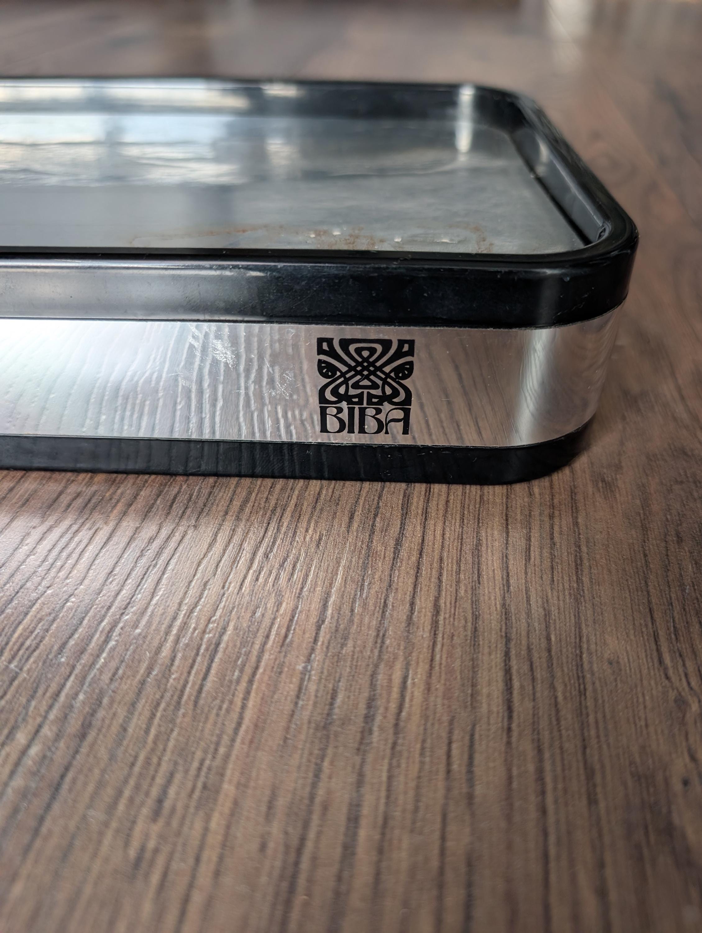Made if thick black plastic if has a silver wrap around the edge with the Biba name and logo stamped on the front corner. The lid is dipped so makeup stands inside easily, they also used to have different moulded tray liners for eye shadows, lipsticks etc.