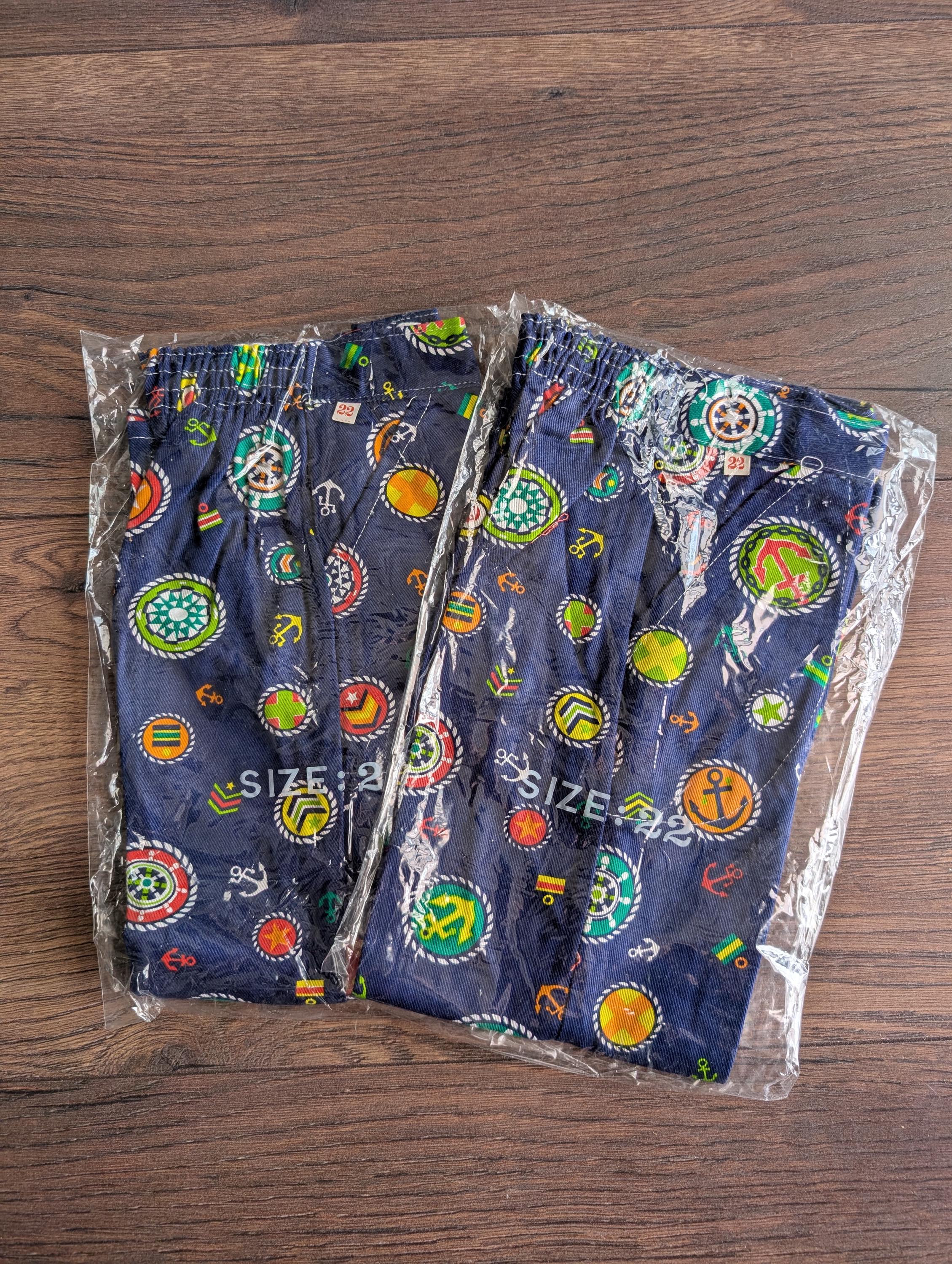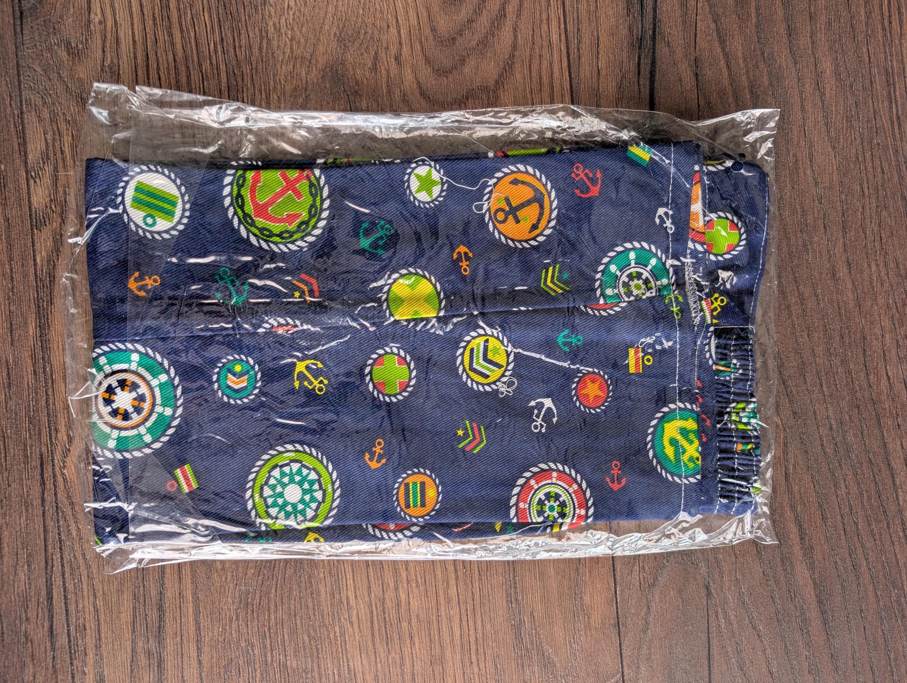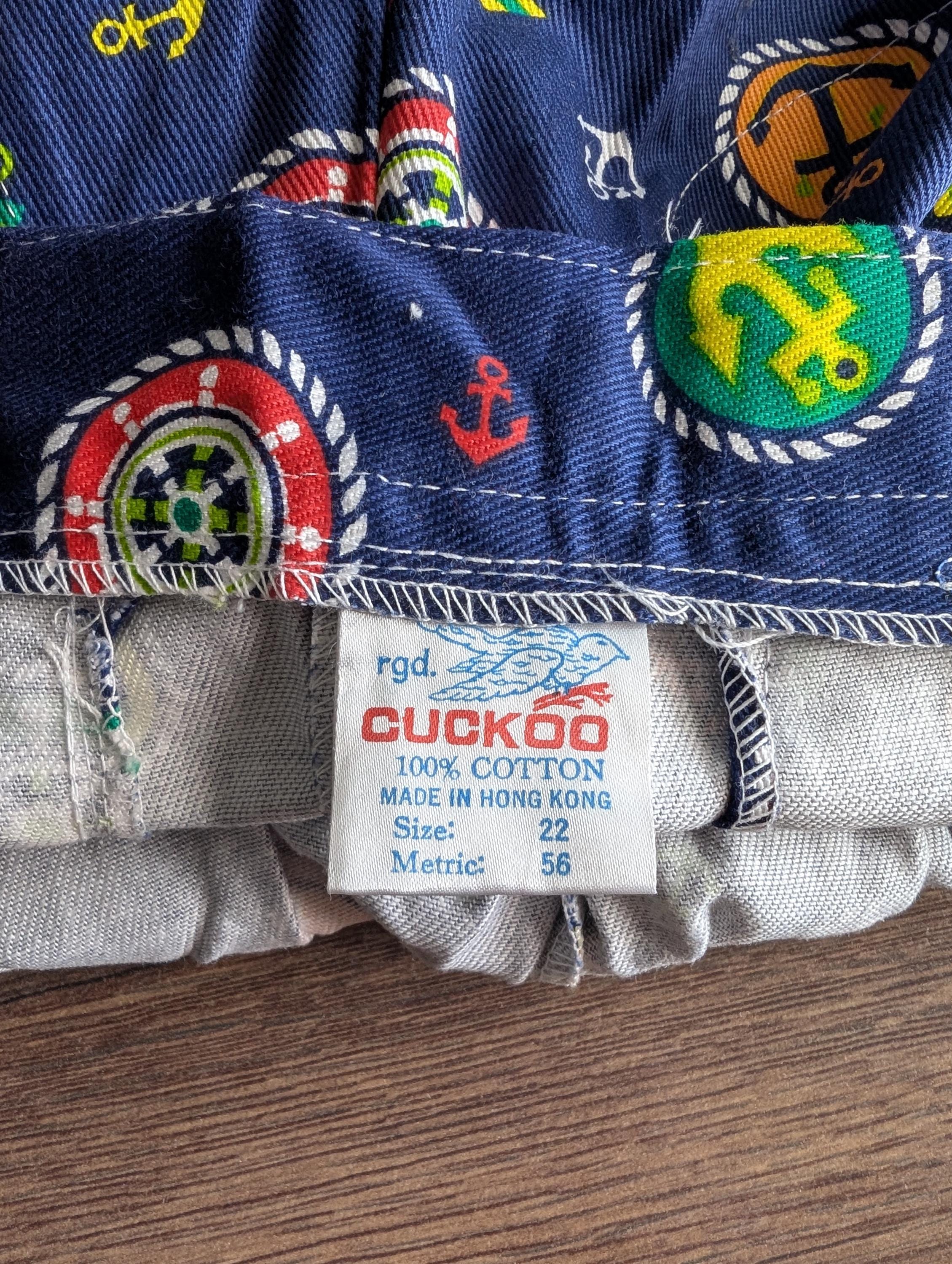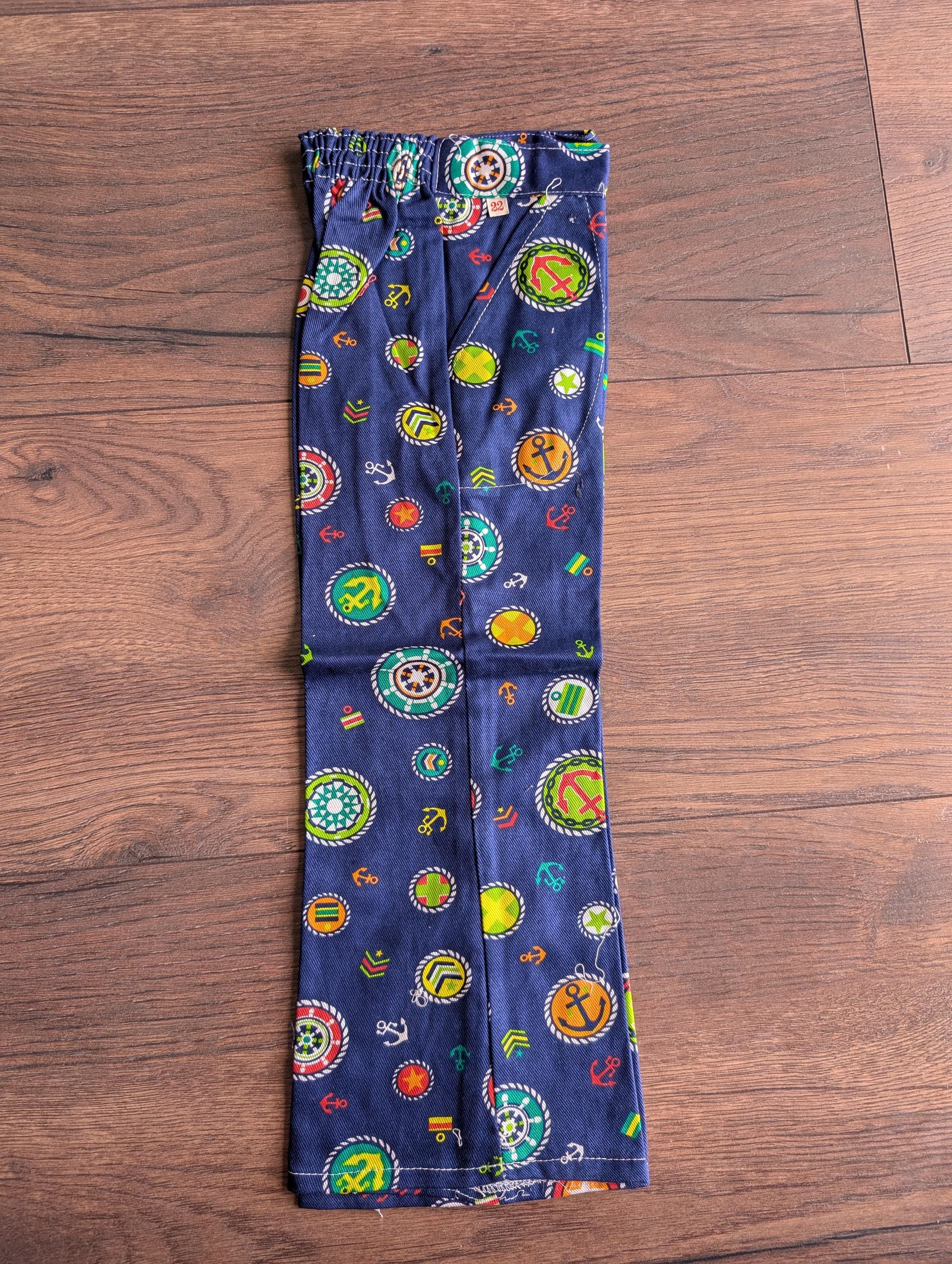 Made by Cuckoo they are still in their original packaging. Bell bottom design with elasticated back waistband for comfort fitting, pockets to either front side with original makers label in the waistband. They feature this super novelty sailor / anchor print all over in bold colours.