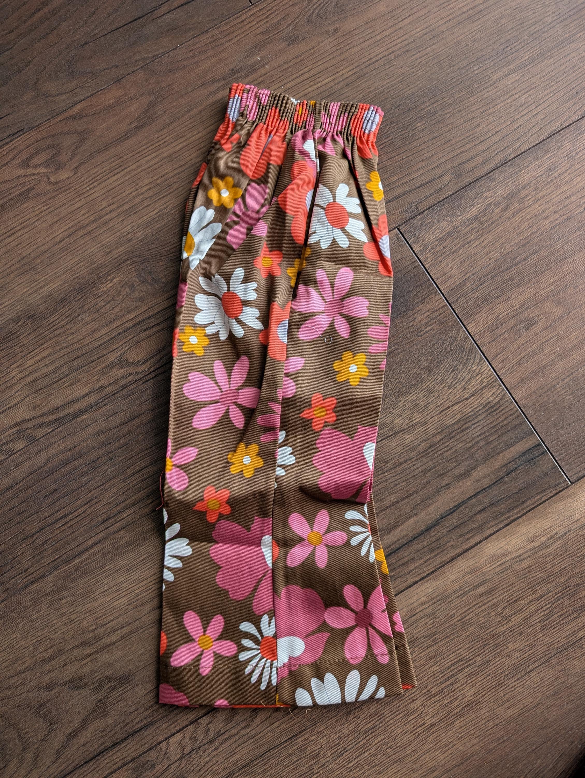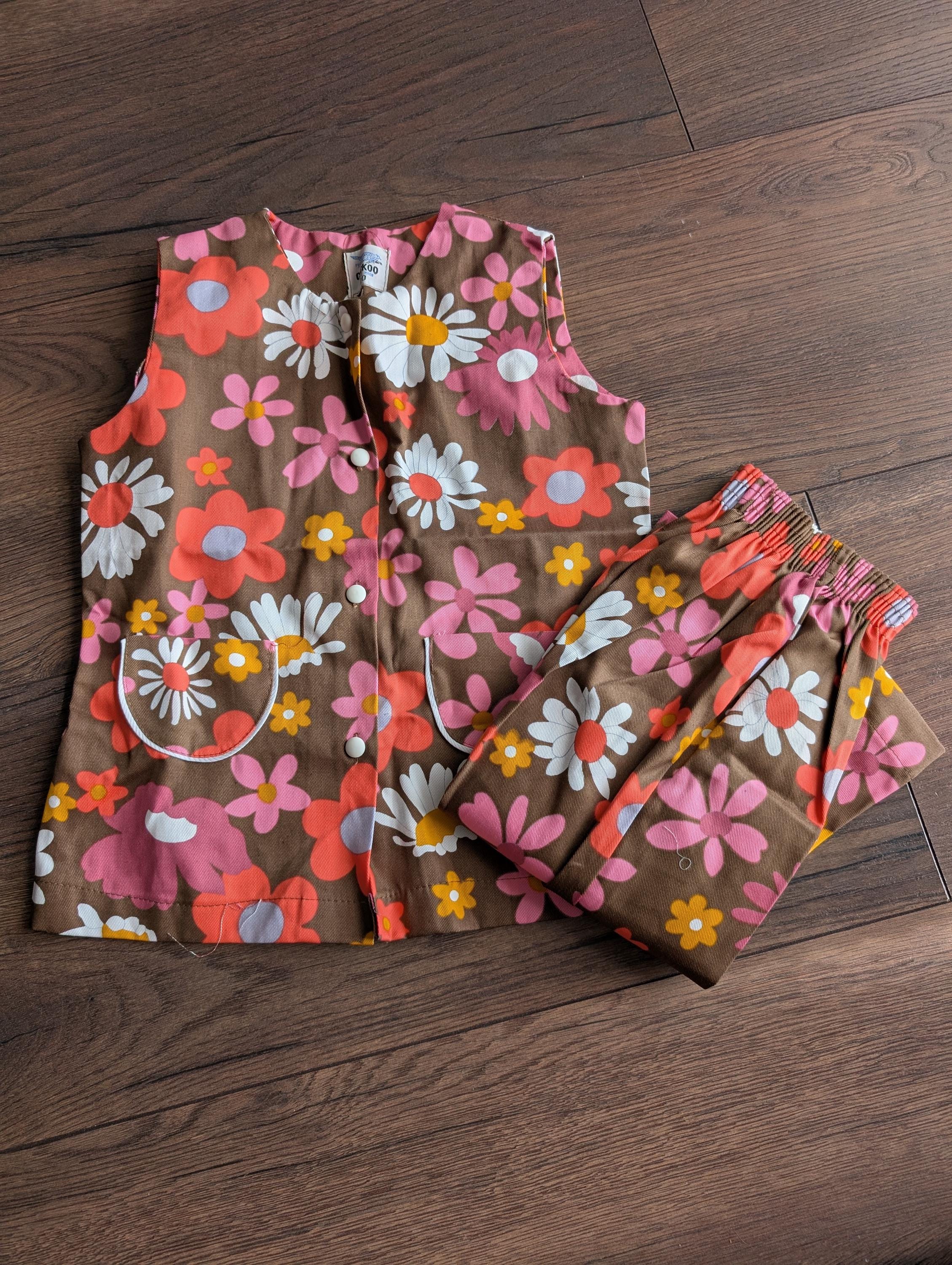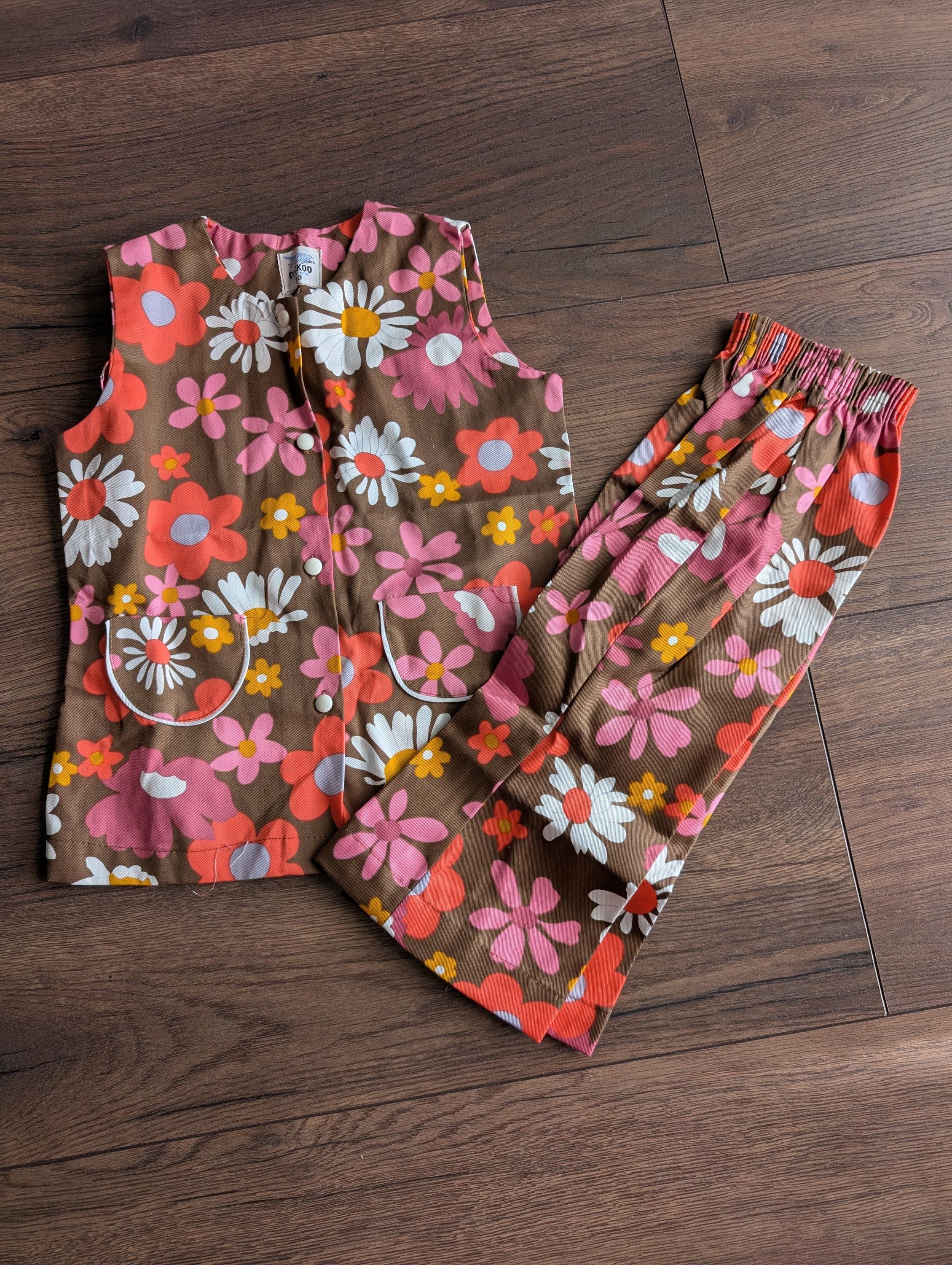 Original Cuckoo deadstock floral design two piece featuring a sleeveless button down front top with two pockets to the front and an elasticated waist pair of bell-bottoms.