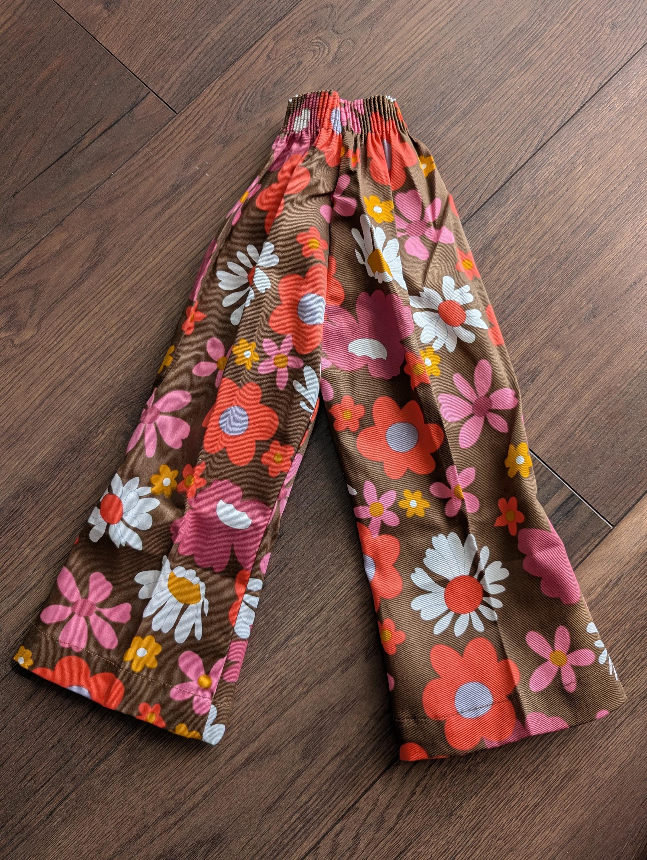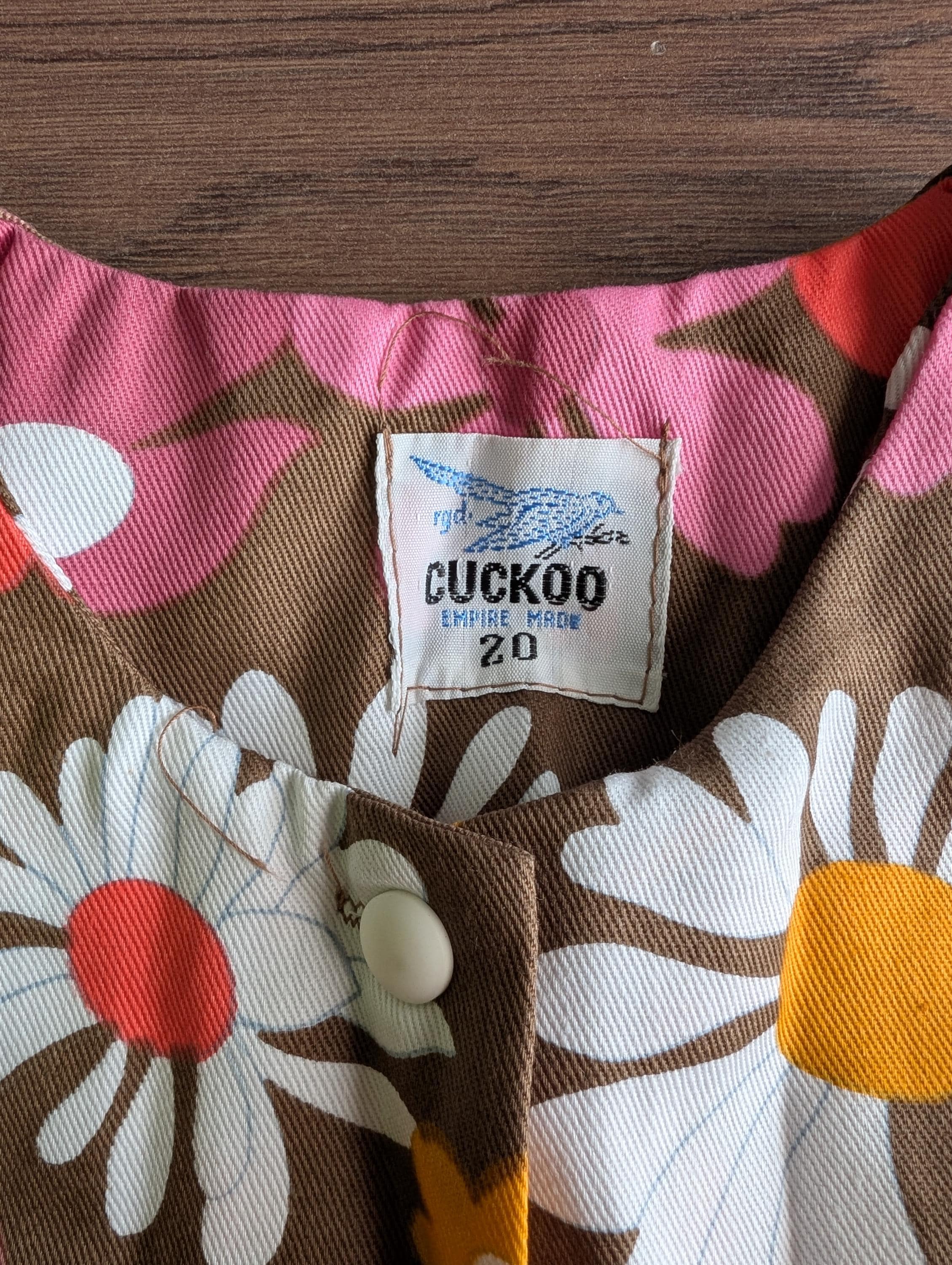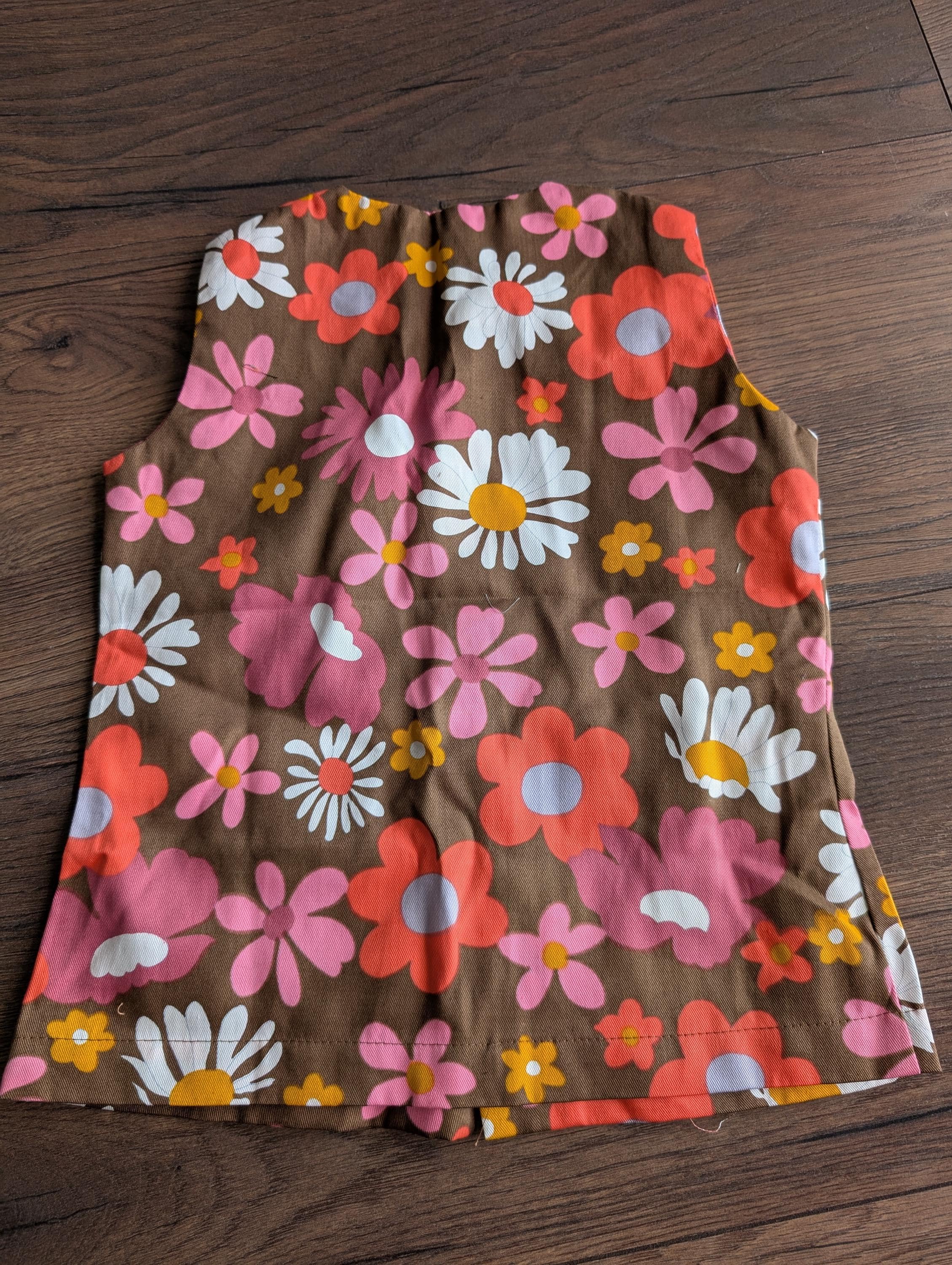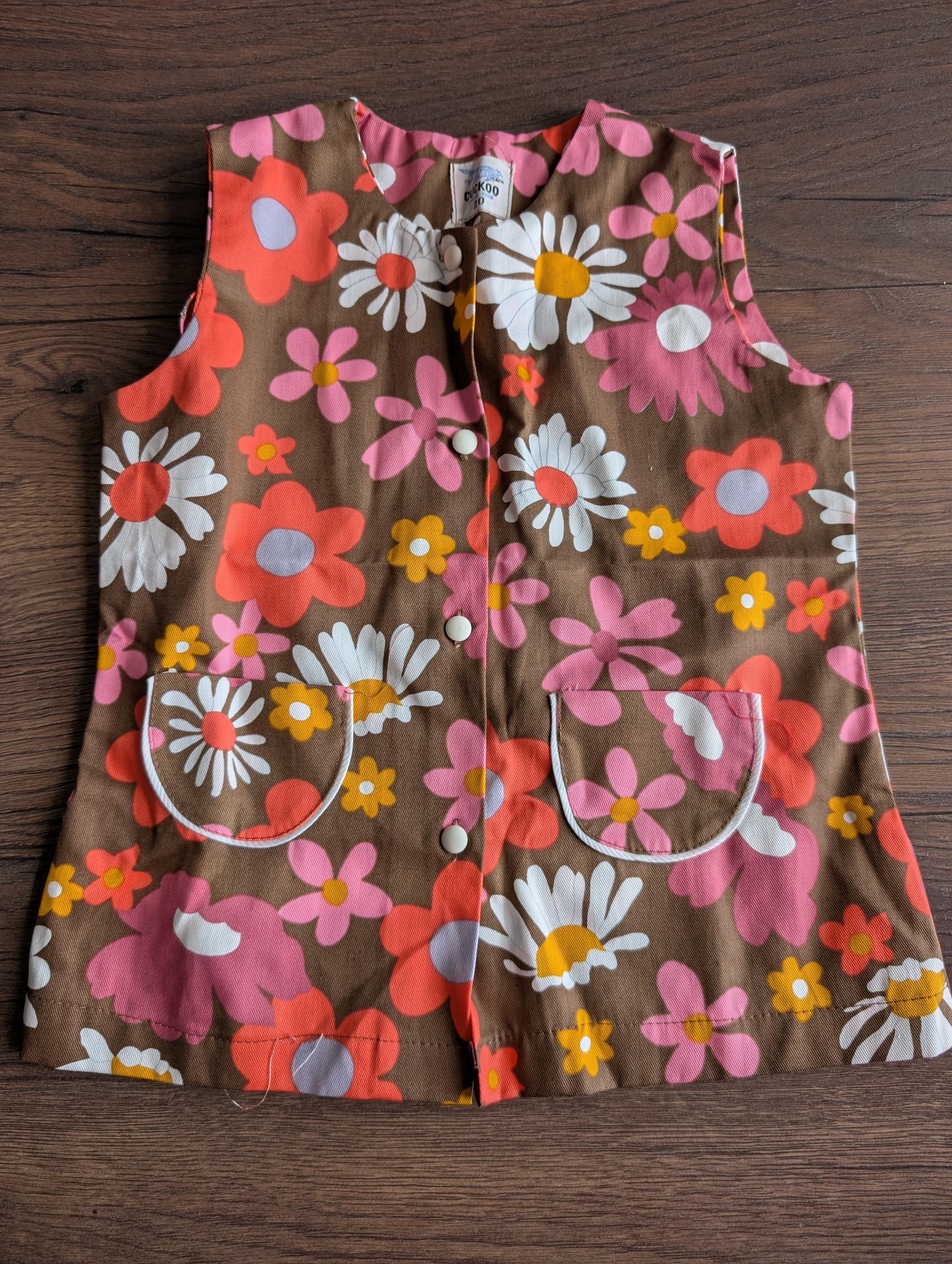 Original Cuckoo deadstock floral design two piece featuring a sleeveless button down front top with two pockets to the front and an elasticated waist pair of bell-bottoms.